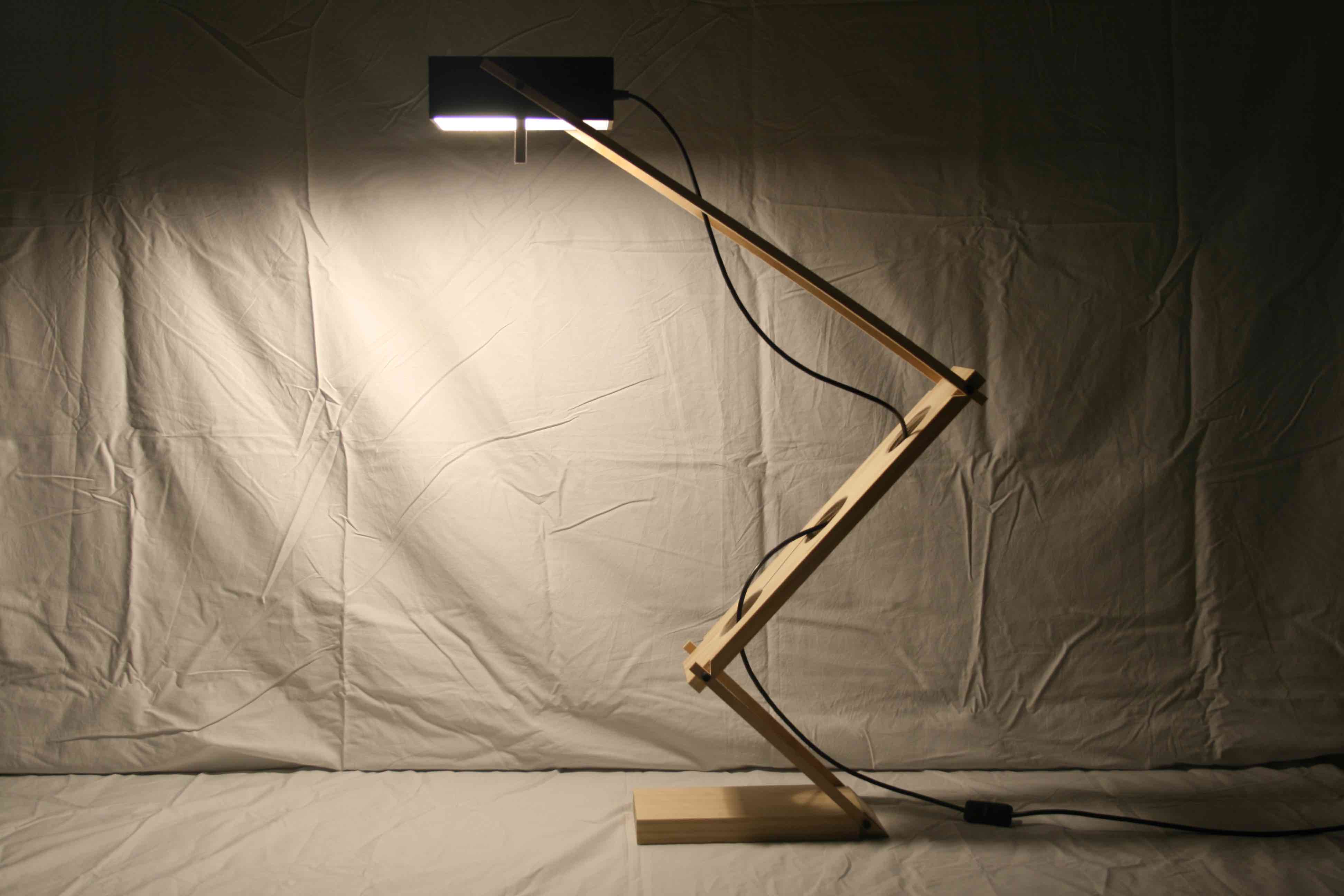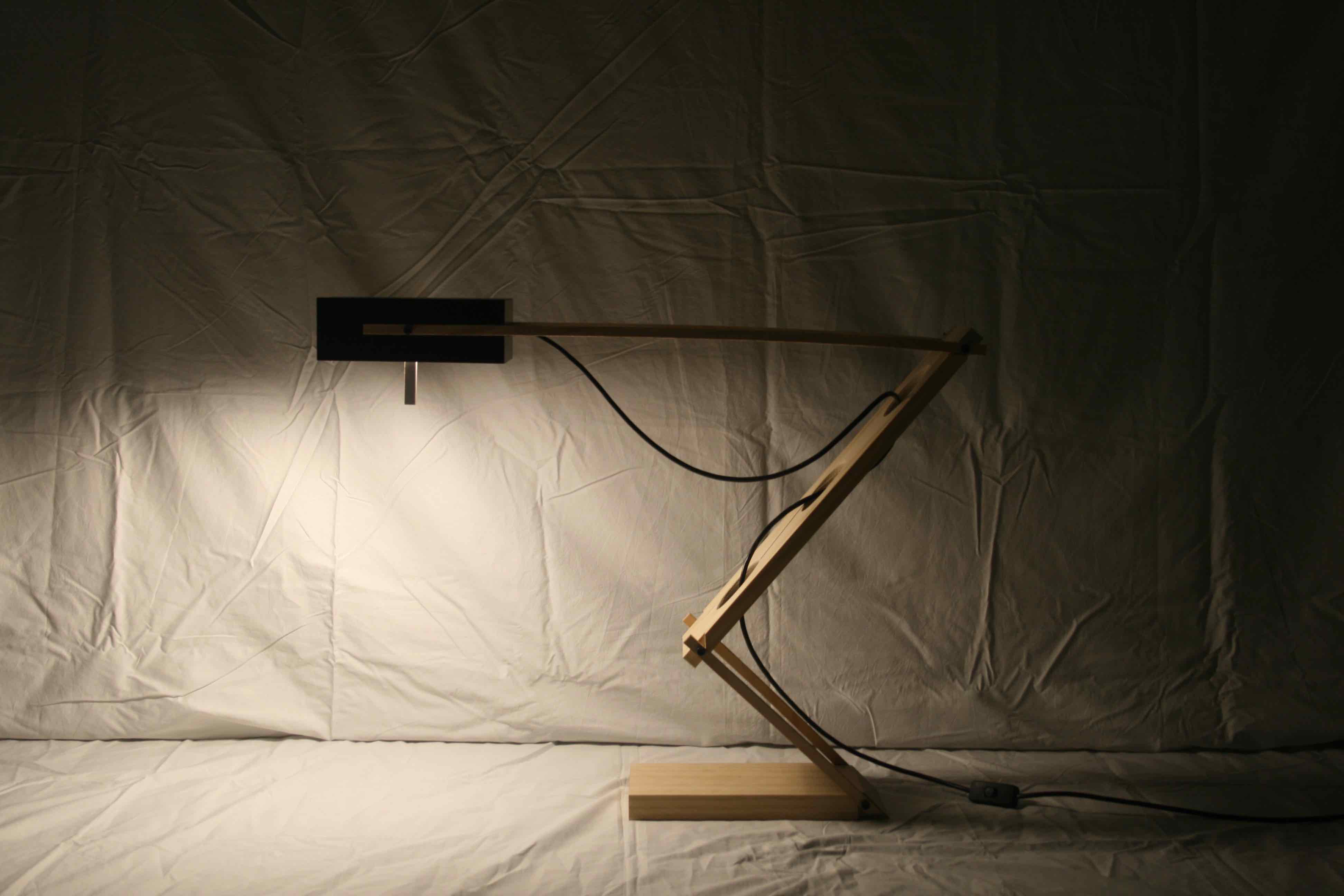 Inspired from a desk lamp designed by Mario Botta, the lamp is made up of thin flat folding planes that allow the lamp shade to be positioned high and low. The different positions of the lamp meet ambient needs and task related needs. The lamp shade design is reminiscent of a dentist lamp with the handle to alter the angle of light as needed.